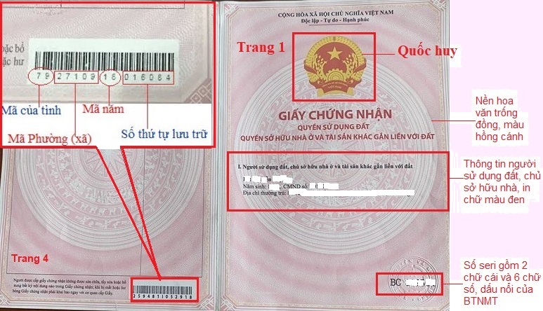 Mục I: Tên người sử dụng đất, chủ sở hữu nhà ở và tài sản khác gắn liền với đất và số phát hành Giấy chứng nhận (số seri) gồm hai chữ cái tiếng Việt và sáu chữ số, được in màu đen; dấu nổi của Bộ Tài nguyên và Môi trường.